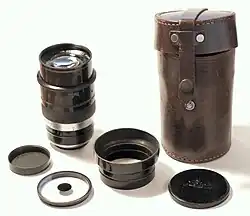 Very rare Leica soft-focus Thambar lens from the 1930s with original leather case. In front, left to right: Rear cap, special dot filter, lens shade, front cap