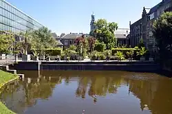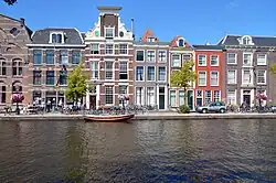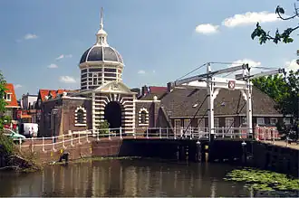 At the strategically important junction of the two arms of the Oude Rijn stands the old castle de Burcht, a circular tower built on an earthen mound. The mound probably was a refuge against high water before a small wooden fortress was built on top of it in the 11th century. The citadel is a so-called motte-and-bailey castle.[25] Of Leiden's old city gates only two are left, the Zijlpoort and the Morspoort,[26] both dating from the end of the 17th century. Apart from one small watch tower on the Singel nothing is left of the town's city walls. Another former fortification is the Gravensteen. Built as a fortress in the 13th century it has since served as house, library and prison.[27] Presently it is one of the university's buildings.