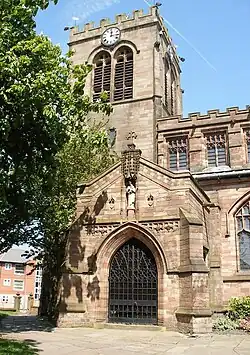Leigh was divided in its allegiance during the English Civil War, some of the population supporting the Royalists' cause while others supported the Parliamentarians. A battle was fought in the town on 2 December 1642, when a group of Chowbenters, men from neighbouring Atherton, beat back and then routed Cavalier troops under the command of James Stanley, the 7th Earl of Derby. Sir Thomas Tyldesley of Myerscough and Morleys Hall, Astley, was killed on 25 August 1651 at the Battle of Wigan Lane and is buried in the Tyldesley Chapel in Leigh Parish Church.[9] The Earl of Derby passed through Leigh again in 1651, when he spent his last night in the King's Arms, before going on to his execution outside Ye Olde Man & Scythe Inn in Bolton.[9]