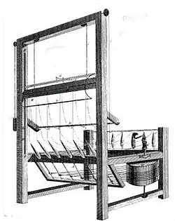 At the end of the 16th century, although agriculture and the dairy industry, particularly the production of Leigh cheese, sometimes known as Leigh Toaster, were important,[17] spinning and weaving began to develop as a cottage industry. Work was supplied from Manchester by agents who brought work weekly often to an inn, and where they collected the finished cloth. At first, the work was done to supplement the income of local farmers and their families. The cloth woven in Leigh was fustian, a sort of rough corduroy, and by the end of the 17th-century middlemen, fustian masters, were dealing directly with weavers and selling the finished cloth in Manchester.[18] It is a tradition in the town that a local man, Thomas Highs, was the inventor of a spinning jenny and the water frame in the 1760s, the latter invention being pirated by Richard Arkwright, who subsequently made a fortune from the patent royalties.[19] These 18th-century improvements to the spinning process meant that handloom weavers were in great demand.[20] but as power looms were introduced in factories in Manchester there was less work for them and there was serious unemployment in the town. In 1827 silk weaving began in Leigh, either as the result of a dispute or a labour shortage in the Middleton silk industry. William Walker was a middleman who opened the first silk mill in Leigh in 1828, and others quickly followed, including James Pownall and Henry Hilton, whose mill survived until 1926.[21][22] Several cotton mills were built in Leigh after the mid-1830s, and some silk mills were converted to cotton after 1870.[9]