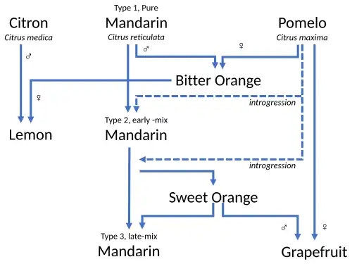 51. ^ a b c d e Curk, Franck; Ollitrault, Frédérique; Garcia-Lor, Andres; Luro, François; Navarro, Luis; Ollitrault, Patrick (2016). "Phylogenetic origin of limes and lemons revealed by cytoplasmic and nuclear markers". Annals of Botany. 11 (4): 565–583. doi:10.1093/aob/mcw005. PMC 4817432. PMID 26944784.