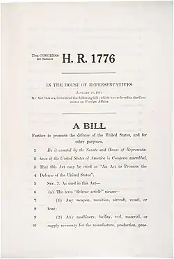 Lend-Lease, formally the Lend-Lease Act and introduced as An Act to Promote the Defense of the United States (Pub. L. 77–11, H.R. 1776, 55 Stat. 31, enacted March 11, 1941),[1][2] was a policy under which the United States supplied the United Kingdom, the Soviet Union, France, the Republic of China, and other Allied nations of the Second World War with food, oil, and materiel between 1941 and 1945. The aid was given free of charge on the basis that such help was essential for the defense of the United States.[2]