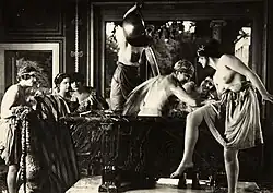 Riefenstahl fell in love with the arts in her childhood.[17][18] She began to paint and write poetry at the age of four.[17] She was also athletic, and at the age of twelve joined a gymnastics and swimming club called Nixe.[14] Her mother was confident her daughter would grow up to be successful in the field of art and therefore gave her full support, unlike Riefenstahl's father, who was not interested in his daughter's artistic inclinations.[14] In 1918, when she was 16, Riefenstahl attended a presentation of Snow White which interested her deeply; it led her to want to be a dancer.[14] Her father instead wanted to provide his daughter with an education that could lead to a more dignified occupation. His wife, however, continued to support her daughter's passion.[14] Without her husband's knowledge, she enrolled Riefenstahl in dance and ballet classes at the Grimm-Reiter Dance School in Berlin, where she quickly became a star pupil.[14]