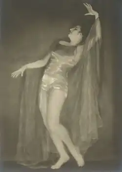 Riefenstahl attended dancing academies and became well known for her self-styled interpretive dancing skills, traveling across Europe with Max Reinhardt in a show funded by Jewish producer Harry Sokal.[19][20] Riefenstahl often made almost 700 ℛ︁ℳ︁ for each performance.[20] She began to suffer a series of foot injuries, which led to knee surgery that threatened her dancing career.[14] It was while going to a doctor's appointment that she first saw a poster for the 1924 film Mountain of Destiny.[21] She became inspired to go into movie making, and began visiting the cinema to see films and also attended film shows.[14]