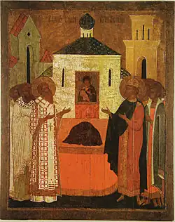 16th cent. Russian icon depicting St. Leo's enshrinement of the Robe of the Theotokos in Sts. Peter and Mark church, Blachernae