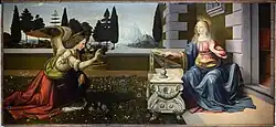 Leonardo first gained attention for his work on the Baptism of Christ, painted in conjunction with Verrocchio. Two other paintings appear to date from his time at Verrocchio's workshop, both of which are Annunciations. One is small, 59 centimetres (23 in) long and 14 cm (5.5 in) high. It is a "predella" to go at the base of a larger composition, a painting by Lorenzo di Credi from which it has become separated. The other is a much larger work, 217 cm (85 in) long.[110] In both Annunciations, Leonardo used a formal arrangement, like two well-known pictures by Fra Angelico of the same subject, of the Virgin Mary sitting or kneeling to the right of the picture, approached from the left by an angel in profile, with a rich flowing garment, raised wings and bearing a lily. Although previously attributed to Ghirlandaio, the larger work is now generally attributed to Leonardo.[111]