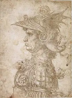In 1506, Leonardo was summoned to Milan by Charles II d'Amboise, the acting French governor of the city.[70] There, Leonardo took on another pupil, Count Francesco Melzi, the son of a Lombard aristocrat, who is considered to have been his favourite student.[37] The Council of Florence wished Leonardo to return promptly to finish The Battle of Anghiari, but he was given leave at the behest of Louis XII, who considered commissioning the artist to make some portraits.[70] Leonardo may have commenced a project for an equestrian figure of d'Amboise;[71] a wax model attributed to him survives and would be the only extant example of Leonardo's sculpture, but the attribution is not widely accepted. Leonardo was otherwise free to pursue his scientific interests.[70] Many of Leonardo's most prominent pupils either knew or worked with him in Milan,[37] including Bernardino Luini, Giovanni Antonio Boltraffio, and Marco d'Oggiono. In 1507, Leonardo was in Florence sorting out a dispute with his brothers over the estate of his father, who had died in 1504.