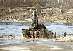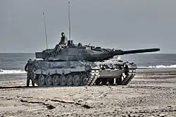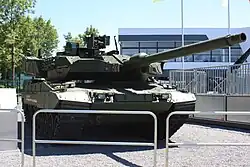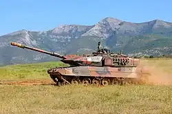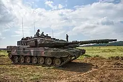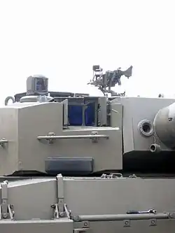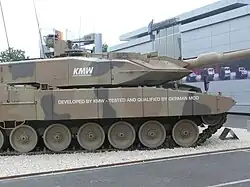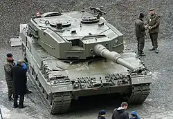 The KWS programme was projected to consist of three stages. The first stage replaced the Rheinmetall 120 mm L/44 gun barrel and the corresponding gun mount with a longer barrelled and more lethal L/55 version.[43] This stage was adopted in the form of 225 Leopard 2A6 tanks, starting in 2001 and lasting until 2005.[44] Stage 2 focused on improvements of armour protection and survivability: it was adopted in the form of the Leopard 2A5, starting in 1995. The base armour of the tank was exchanged and additional armour modules were installed at the turret. The first batch of 225 Leopard 2 tanks was upgraded to Leopard 2A5 configuration between 1995 and 1998; a second batch of 125 followed from 1999 to 2002.[45]