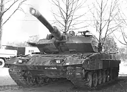 One year later, a choice was made to continue the development based on the earlier Keiler project of the late 1960s, instead of finishing the development of the Eber. In 1971, the name of the design was determined as Leopard 2 with the original Leopard retroactively becoming the Leopard 1, and Paul-Werner Krapke became the project officer of the Leopard 2 program.[17] Originally two versions were projected: the gun-armed Leopard 2K and the Leopard 2FK, which would be armed with the XM150 gun/launcher weapon of the MBT-70.[18]