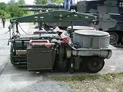 The West German company Krupp-Atlas-Elektronik acquired the licence of the Hughes design and modified it to meet the needs of the West German army.[37] The modified rangefinder received the designation EMES-15. The installation of the US AGT-1500 turbine engine in the Leopard 2 was tested by MaK.[38] The AGT-1500 was from the United States and required deep modifications to the Leopard 2's chassis. However, driving tests at the WTD 41 revealed a number of drawbacks such as high fuel consumption and the poor performance of the transmission including the brakes.[38] This project was thus terminated.