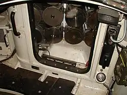 In comparison with the earlier Leopard 2 prototypes, the fire control system was simplified by replacing the EMES-12 optical rangefinder and removing the crosswind sensor, the air pressure and temperature sensors, the powder temperature sensor, the PERI R12 commander sight with IR searchlight, the short-range grenade launcher for use against infantry, the retractable searchlight, the spotlight, the retractable passive night vision sight, the APU and the mechanical loading assistant.[26]