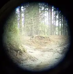 The Leopard 2AV (austere version) was based on the experiences of the previous Leopard 2 development. It was created in order to meet the U.S. requirements and the latest protection requirements of the West German MoD. The T14 mod turret was used as the base for the Leopard 2AV's turret, but meeting the required level of protection for the hull required several attempts until the final ballistic trials on 23 to 26 June 1976.[27] Following the U.S. preference of laser rangefinders, the turret of prototype PT19 was fitted with a laser rangefinder developed together with the American company Hughes.[28]