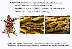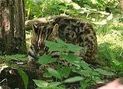 Leopard cat subspecies differ widely in fur colour, tail length, skull shape and size of carnassials.[3] Archaeological evidence indicates that the leopard cat was the first cat species domesticated in Neolithic China about 5,000 years ago in Shaanxi and Henan Provinces.[4]