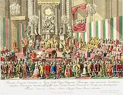 Leopold II (Peter Leopold Josef Anton Joachim Pius Gotthard; 5 May 1747 – 1 March 1792) was the penultimate Holy Roman Emperor, as well as King of Hungary, Croatia and Bohemia, and Archduke of Austria from 1790 to 1792, and Grand Duke of Tuscany from 1765 to 1790.[1] He was a son of Empress Maria Theresa and Emperor Francis I, and the brother of Queen Marie Antoinette of France, Queen Maria Carolina, Duchess Maria Amalia of Parma, and Emperor Joseph II. Leopold was a moderate proponent of enlightened absolutism like his brother Joseph II.[2] He granted the Academy of Georgofili his protection. Unusually for his time, he opposed the death penalty and torture and abolished it in Tuscany on 30 November 1786 during his rule there, making it the first nation in modern history to do so. This act has been commemorated since 2000 by a regional custom known as the Feast of Tuscany, held every 30 November.[3][4] Despite his brief reign, he is highly regarded. The historian Paul W. Schroeder called him "one of the most shrewd and sensible monarchs ever to wear a crown".[5]