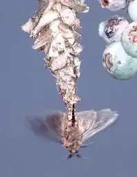 Different herbivorous species have adapted to feed on every part of the plant and are normally considered pests to their host plants; some species lay their eggs on fruit, others on clothing or fur (e. g., Tineola bisselliella, the clothes moth). Some are carnivorous, and others are parasitic. Some lycaenid species such as Phengaris rebeli are social parasites of Myrmica ant nests.[54] A species of Geometridae from Hawaii has carnivorous larvae that catch and eat flies.[55] Some pyralid caterpillars are aquatic.[56] The larvae develop rapidly with several generations in a year; however, some species may take up to 3 years to develop, and exceptional examples like Gynaephora groenlandica take as long as seven years.[13]