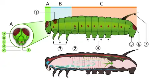 The larvae or caterpillars are the first stage in the life cycle after hatching. Caterpillars are "characteristic polypod larvae with cylindrical bodies, short thoracic legs, and abdominal prolegs (pseudopods)".[51] They have a sclerotized head capsule, mandibles (mouthparts) for chewing, and a soft tubular body. The body has three pairs of true legs, and up to five pairs of prolegs; there may be hairs or other projections.[52] The body consists of thirteen segments, of which three are thoracic and ten are abdominal.[53] Most larvae are herbivores, but a few are carnivores or detritivores.[52]