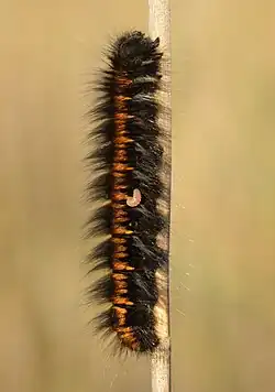 Moths engage in acoustic communication, most often as courtship, attracting mates using sound or vibration. They pick up these sounds using tympanic membranes in the abdomen.[79] An example is that of the polka-dot wasp moth (Syntomeida epilais), which produces sounds with a frequency above that normally detectable by humans (about 20 kHz). These sounds also function as tactile communication, or communication through touch, as they stridulate, or vibrate a substrate like leaves and stems.[43]