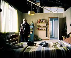 A key passage in the novel details what happens when a vampire enters a room uninvited, an action that traditional vampire lore usually prohibits.[15] Alfredson originally wanted to omit this from the film, but Ajvide Lindqvist was adamant that it had to be included.[14] Alfredson was initially nervous about the scene. He realised in post-production that the sound effects and music made it "American, in a bad way", and had to be removed for the scene to work.[16] The result, which shows Eli slowly beginning to bleed from her eyes, ears, and pores, received positive notices from many critics.[17][18][19] Peter Bradshaw of The Guardian described it as a "haemophilia of rejection".[15]