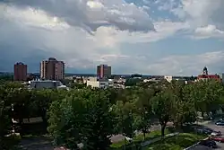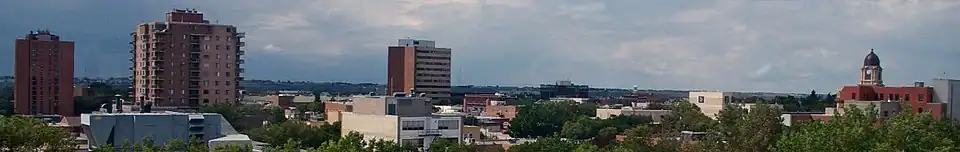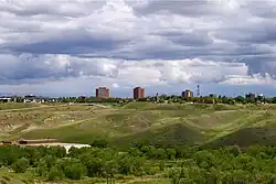 Lethbridge is split into three geographical areas: north, south and west. The Oldman River separates West Lethbridge from the other two, while Crowsnest Trail and the Canadian Pacific Kansas City rail line separate North and South Lethbridge.[22] The newest and largest of the three areas, West Lethbridge (pop. 40,898)[23] is home to the University of Lethbridge—which opened at that site in 1971. Although several farms existed on what is now the Westside, the first housing development was not completed until 1974 and Whoop-Up Drive access opened only in 1975.[24] Much of the city's recent growth has been on the west side, and it has the youngest median age of the three. The north side (pop. 28,172)[23] was originally populated by workers from local coal mines. It has the oldest population of the three areas, is home to multiple industrial parks and includes the former Hamlet of Hardieville, which was annexed by Lethbridge in 1978.[25][26] South Lethbridge (pop. 32,412)[23] is the commercial heart of the city; it contains the downtown core, Downtown Lethbridge, the bulk of retail and hospitality establishments, and the Lethbridge Polytechnic.