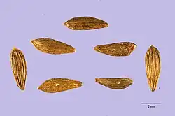 Once plants move past the edible stage, they develop flower stalks up to 1 m (3 ft 3 in) high with small yellow blossoms.[17] Like other members of the tribe Cichorieae, lettuce inflorescences (also known as flower heads or capitula) are composed of multiple florets, each with a modified calyx called a pappus (which becomes the feathery "parachute" of the fruit), a corolla of five petals fused into a ligule or strap, and the reproductive parts. These include fused anthers that form a tube which surrounds a style and bipartite stigma. As the anthers shed pollen, the style elongates to allow the stigmas, now coated with pollen, to emerge from the tube.[15][18] The ovaries form compressed, obovate (teardrop-shaped) dry fruits that do not open at maturity, measuring 3 to 4 mm long. The fruits have 5–7 ribs on each side and are tipped by two rows of small white hairs. The pappus remains at the top of each fruit as a dispersal structure. Each fruit contains one seed, which can be white, yellow, gray or brown depending on the variety of lettuce.[1]