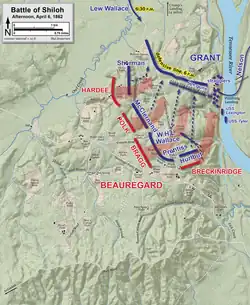 Wallace's most controversial command came at the battle of Shiloh, where he continued as the 3rd Division commander under Maj. Gen. Grant. What was to become a long-standing controversy developed around the contents of Wallace's written orders on April 6, the 3rd Division's movements on the first day of battle, and its late arrival on the field.[48] The next day, the reinforcement by Wallace's division and the juncture of Maj. Gen. Don Carlos Buell's Army of the Ohio permitted the Union forces to push back the enemy all day long to gain the victory.[49]