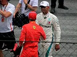 Figures in the sport, such as Emerson Fittipaldi and Christian Horner, have voiced their support for Hamilton's ability to connect with fans, while Bernie Ecclestone frequently commented on his admiration of Hamilton's ability to promote the sport, observing how he is happy to engage with fans, unlike some of his peers.[228] In 2019, The Telegraph sports journalist Luke Slater went as far as to argue that "[t]here have been few better representatives of the sport than Hamilton ... [both] on and off the track."[230] Following Hamilton's knighthood in 2020,[231] newly appointed Formula One CEO Stefano Domenicali said that Hamilton is "a true giant of our sport" and that "his influence is huge both in and out of a car".[232]
