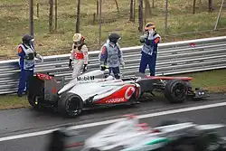 In 2010, Hamilton was partnered by reigning World Drivers' Champion Jenson Button.[78] Whilst McLaren struggled to match the outright pace of Red Bull and Ferrari,[79] Hamilton engaged in a four-way title battle with Alonso, Sebastian Vettel and Mark Webber throughout the season. At the Canadian Grand Prix, he secured McLaren's only pole position of the season, and took the championship lead after winning the race.[80] Hamilton's latter half of the season unravelled with a number of misfortunes, including race-ending collisions and mechanical failures, culminated in him losing vital points to his rivals, and ultimately, the championship lead.[81] He entered the final round of the season with an outside chance of winning the title, but finished fourth in the standings as Vettel won his maiden title.[82]