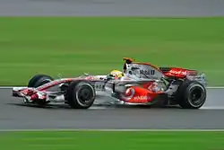 Partnering Heikki Kovalainen for 2008, Hamilton's winning form continued as he amassed five race victories and 10 podium finishes. Ferrari drivers, along with BMW's Robert Kubica, emerged as his closest rivals, as they engaged in a close battle for the title with Hamilton during the first half of the season. At the rain-affected British Grand Prix, he won by over a minute from second-placed Nick Heidfeld, which was widely acclaimed as one of the greatest wet-weather performances in Formula One history.[72] As the season progressed towards the closing rounds, the championship became a clear two-way fight between Hamilton and Ferrari's Felipe Massa. Hamilton won his maiden title at the season-ending Brazilian Grand Prix, overtaking Timo Glock for fifth-place at the final corners of the last lap to become the then-youngest World Drivers' Champion, and deny race-winner Massa the title by one point.[73][74] Hamilton also became the first British driver to win the World Drivers' Championship since Damon Hill in 1996.[75]