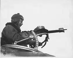British Mark IV tanks used the Lewis, replacing the Vickers and Hotchkiss used in earlier tanks. The Lewis was chosen for its relatively compact magazines, but the ventilation system inside the tank caused the airflow to be reversed through the Lewis cooling jacket, resulting in hot air and fumes being blown into the gunner's face.[41] As soon as an improved belt feed for the Hotchkiss was developed, the Lewis was replaced by them in later tank models.[42]