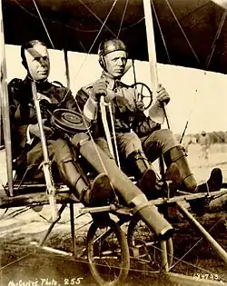 Captain Charles Chandler (with prototype Lewis Gun) and Lt Roy Kirtland in a Wright Model B Flyer after the first successful firing of a machine gun from an aeroplane in June 1912