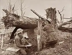 The gun was operated by a team of seven. Bullock was the First Lewis Gunner who carried the gun and a revolver, while 'The Second Gunner carried a bag containing spare parts, and the remaining five members of the team carried loaded pans of ammunition'. Bullock noted, 'all could fire the gun if required, and all could effect repairs in seconds'.[30] Bullock provides several vivid descriptions of the gun's use in combat. For example, on 13 April 1918 he and his fellow soldiers intercepted a German advance along the Calonne/Robecq road, noting 'we fired the gun in turns until it was too hot to hold'[31] and recording that 400 German casualties were caused, 'chiefly by my Lewis gun!'.[32][33]