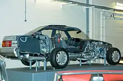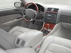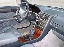 The LS 400 was among the first luxury sedans to feature an automatic tilt-and-telescoping steering wheel with SRS airbag, power adjustable shoulder seat belts, and an electrochromic rear-view mirror.[37][38] The five-passenger cabin included California walnut and leather trim, power-adjustable seats, and soft-touch controls. A back-lit electro-luminescent gauge cluster featured a holographic visual effect, with indicator lights projected onto the instrument panel.[37][39] The memory system stored the driver's seat, side mirror, steering wheel, and seat belt positions. Available luxury options included a Nakamichi premium sound system and an integrated cellular telephone with hands-free capabilities.[27][40][41] The LS 400 further contained some 300 technological innovations to aid smooth operation and silence,[27] including fluid-damped cabin fixtures,[42] vibration-insulating rubber mounts,[43] airflow fairings,[44] and sandwich steel body panels.[43]