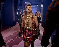 Donovan described the thought process behind the show as "Dirty Dozen meets Alien or Beavis and Butt-Head".[5] He also found inspiration in Fires on the Plain and Dark Star[6] and considers the show to be a homage to Space Precinct.[8] Many of the crew were also fans of Red Dwarf.[9] Donovan found that many science fiction films and shows at the time were too serious and wanted to create something more "fun" with a higher production value, sexual motifs, and aspects of dark humour, which Hirschfield says comes from the desensitization of violence in Halifax, citing clubbing harp seals as an example.[5] They rejected making the series scientifically accurate or logical, with writer Hirschfield explaining, "We only wanted enough science to get us through the stories. The Lexx has a particle accelerator, and that's all you need to know. We don't want to bother with dilithium crystals. The Lexx gets its fuel from eating. Simple enough."[7] They openly acknowledged the large amount of sex and violence present within the script, with Gigeroff admitting that he "[wants] teenage boys to pull off to Zev's poster." When asked about Zev's appearance and the amount of sexual content, Gigeroff responded that "I think we have far too puritanical notions about sex. Sex is fun, sex is good, and I hope we can get a lot of it in the show." He also addressed the criticism he received from the Halifax film community about the sexual content, joking "God, you can't even show a woman as a sex object without someone thinking it's bad."[7] The Lexx's name was formed by finding a word that would work well in all languages without translation, and it doubled as a pun on Lex Gigeroff's name.[7]
