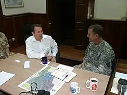 Fox voted for the 2003 invasion of Iraq. As Shadow Defence Secretary he supported the Government's position of maintaining British troops in Iraq until the security situation allowed for a withdrawal of troops but was critical of the lack of post-invasion planning and poor equipment initially provided to British troops.[19] He supported the idea of the American Surgel, believing that it was successful, and visited Iraq several times as Shadow Defence Secretary.[20]