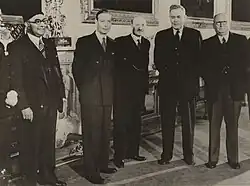 In 1945–46, mass elections were held in India and Khan won the Central Legislature election from the Meerut Constituency in the United Provinces. He was also elected Chairman of the League's Central Parliamentary Board. The Muslim League won 87% of seats reserved for Muslims of British India.[24] He assisted Jinnah in his negotiations with the members of the Cabinet Mission and the leaders of the Congress during the final phases of the Freedom Movement and it was decided that an interim government would be formed consisting of members of the Congress, the Muslim League and minority leaders. When the Government asked the Muslim League to send five nominees for representation in the interim government, Khan was asked to lead the League group in the cabinet. He was given the portfolio of finance. The other four men nominated by the League were Ibrahim Ismail Chundrigar, Ghazanfar Ali Khan, Abdur Rab Nishtar, and Jogendra Nath Mandal.[25] By this point, the British government and the Indian National Congress had both accepted the idea of Pakistan, which came into existence on 14 August 1947.[20]
