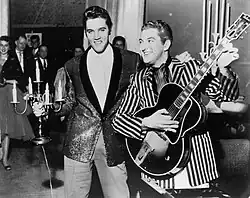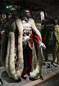 Re-energized, Liberace returned to Las Vegas, and increasing the glamour and glitz, he took on the sobriquet Mr. Showmanship.[42] As his act swelled with spectacle, he famously stated "I'm a one-man Disneyland."[43] The costumes became more exotic (ostrich feathers, mink, capes, and huge rings), entrances and exits more elaborate (chauffeured onstage in a Rolls-Royce or dropped in on a wire like Peter Pan), choreography more complex (involving chorus girls, cars, and animals), and talented novelty acts. Juvenile acts included Australian singer Jamie Redfern and Canadian banjo player Scotty Plummer.[44] Barbra Streisand was the most notable new adult act he introduced, appearing with him early in her career.[45]