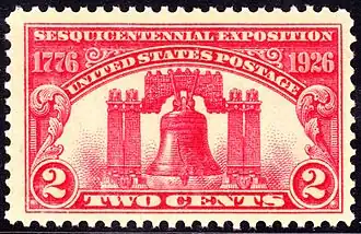 On the 150th anniversary of the Declaration of Independence in 1926, the U.S. Post Office issued a commemorative stamp depicting the Liberty Bell for the Sesquicentennial Exposition in Philadelphia in 1926,[104] though this stamp actually depicts the replica bell erected at the entrance to the exposition grounds.[105] The Liberty Bell was chosen for the stamp design theme because the symbol was most representative of the nation's independence.[106] Since then the Liberty Bell has appeared on several other U.S. postage stamps,[107] including the first forever stamp, issued since 2007.[108]