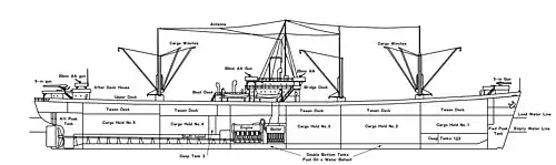 The basic EC2-S-C1 cargo design was modified during construction into three major variants with the same basic dimensions and slight variance in tonnage. One variant, with basically the same features but different type numbers, had four rather than five holds served by large hatches and kingpost with large capacity booms. Those four hold ships were designated for transport of tanks and boxed aircraft.[12]