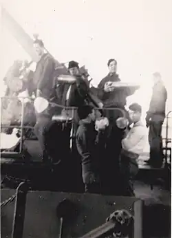 Seamen during shell loading practice aboard SS Lawton B. Evans in 1943
