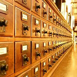 Libraries should inform their users of what materials are available in their collections and how to access that information. Before the computer age, this was accomplished by the card catalogue—a cabinet (or multiple cabinets) containing many drawers filled with index cards that identified books and other materials. In a large library, the card catalogue often filled a large room.[23]