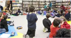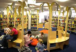 Children's libraries are special collections of books intended for juvenile readers and usually kept in separate rooms of general public libraries.[56] Some children's libraries have entire floors or wings dedicated to them in bigger libraries while smaller ones may have a separate room or area for children. They are an educational agency seeking to acquaint the young with the world's literature and to cultivate a love for reading. Their work supplements that of the public schools.[57][58]