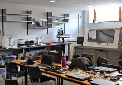 A library makerspace is a creative, hands-on makerspace located within a library that provides tools, technology, and spaces for patrons to design, prototype, and create projects. Some makerspaces in libraries could include a photographic studio, digital recording studio, sewing room, computer lab cubicles, woodshop / machine shop and other hardware equipment spaces or fab labs for 3D printers, CNC machines, laser cutters, laser engraving, injection molding machines, sewing machines, electronics and electronic kits. They may also offer software for graphic design, video editing, 3D modeling \ 3D rendering, or computer programming educational resources. Library makerspaces aim to expand the traditional role of libraries from primarily providing access to books and information toward enhancing hard skills and enabling active learning by doing. These spaces support STEM and STEAM education, digital literacy, and lifelong learning for all ages. Activities can range from code clubs, robotics clubs to arts, crafts, and multimedia production.[79][80][81]