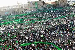 The first civil war came during the Arab Spring movements which overturned the rulers of Tunisia and Egypt. Libya first experienced protests against Gaddafi's regime on 15 February 2011, with a full-scale revolt beginning on 17 February.[82] Libya's authoritarian regime led by Muammar Gaddafi put up much more of a resistance compared to the regimes in Egypt and Tunisia. While overthrowing the regimes in Egypt and Tunisia was a relatively quick process, Gaddafi's campaign posed significant stalls on the uprising in Libya.[83] The first announcement of a competing political authority appeared online and declared the Interim Transitional National Council as an alternative government. One of Gaddafi's senior advisors responded by posting a tweet, wherein he resigned, defected, and advised Gaddafi to flee.[84] By 20 February, the unrest had spread to Tripoli. On 27 February 2011, the National Transitional Council was established to administer the areas of Libya under rebel control. On 10 March 2011, the United States and many other nations recognised the council headed by Mahmoud Jibril as acting prime minister and as the legitimate representative of the Libyan people and withdrawing the recognition of Gaddafi's regime.[85][86]
