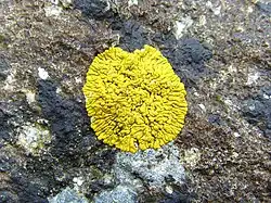 The thallus is not always the part of the lichen that is most visually noticeable. Some lichens can grow inside solid rock between the grains (endolithic lichens), with only the sexual fruiting part visible growing outside the rock.[37] These may be dramatic in color or appearance.[37] Forms of these sexual parts are not in the above growth form categories.[37] The most visually noticeable reproductive parts are often circular, raised, plate-like or disc-like outgrowths, with crinkly edges, and are described in sections below.