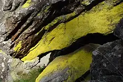 Different colored lichens may inhabit different adjacent sections of a rock face, depending on the angle of exposure to light.[42] Colonies of lichens may be spectacular in appearance, dominating much of the surface of the visual landscape in forests and natural places, such as the vertical "paint" covering the vast rock faces of Yosemite National Park.[43]