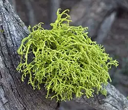 Lichens come in many colors.[15]: 4 Coloration is usually determined by the photosynthetic component.[36] Special pigments, such as yellow usnic acid, give lichens a variety of colors, including reds, oranges, yellows, and browns, especially in exposed, dry habitats.[42] In the absence of special pigments, lichens are usually bright green to olive gray when wet, gray or grayish-green to brown when dry.[42] This is because moisture causes the surface skin (cortex) to become more transparent, exposing the green photobiont layer.[42] Different colored lichens covering large areas of exposed rock surfaces, or lichens covering or hanging from bark can be a spectacular display when the patches of diverse colors "come to life" or "glow" in brilliant displays following rain.