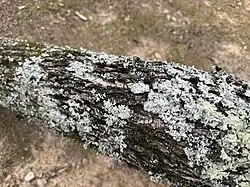 When a crustose lichen gets old, the center may start to crack up like old-dried paint, old-broken asphalt paving, or like the polygonal "islands" of cracked-up mud in a dried lakebed. This is called being rimose or areolate, and the "island" pieces separated by the cracks are called areolas.[37] The areolas appear separated, but are (or were) connected by an underlying prothallus or hypothallus.[40] When a crustose lichen grows from a center and appears to radiate out, it is called crustose placodioid. When the edges of the areolas lift up from the substrate, it is called squamulose.[41]: 159 [39]