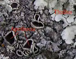 A "podetium" (plural: podetia) is a lichenized stalk-like structure of the fruiting body rising from the thallus, associated with some fungi that produce a fungal apothecium.[38] Since it is part of the reproductive tissue, podetia are not considered part of the main body (thallus), but may be visually prominent.[38] The podetium may be branched, and sometimes cup-like. They usually bear the fungal pycnidia or apothecia or both.[38] Many lichens have apothecia that are visible to the naked eye.[4]