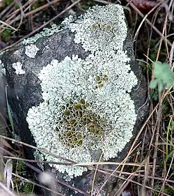 Lichens may be long-lived, with some considered to be among the oldest living organisms.[6][24] Lifespan is difficult to measure because what defines the "same" individual lichen is not precise.[66] Lichens grow by vegetatively breaking off a piece, which may or may not be defined as the "same" lichen, and two lichens can merge, then becoming the "same" lichen.[66] One specimen of Rhizocarpon geographicum on East Baffin Island has an estimated age of 9500 years.[67][68] Thalli of Rhizocarpon geographicum and Rhizocarpon eupetraeoides/inarense in the central Brooks Range of northern Alaska have been given a maximum possible age of 10,000–11,500 years.[69][70]