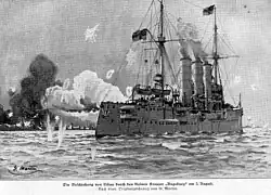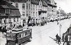 Following the outbreak of World War I on 2nd August 1914 , the German cruiser SMS Magdeburg shelled Liepāja (then part of Russia), and other vessels laid mines off the approaches to the port.[21] Liepāja was occupied by the German Army, on 7 May 1915, and in memory of this event, a monument was constructed on Kūrmājas Prospect in 1916 and removed in 1919 by the new Latvian State. Liepāja's local government issued its own money for a while in this period – Libaua rubles. An advanced German Zeppelin base was constructed at Vaiņode, near Liepāja, with five hangars, in August 1915.[22] On 23 October 1915, the German cruiser SMS Prinz Adalbert was sunk by the British submarine HMS E8, 37 km (20 nmi; 23 mi) west of Liepāja.